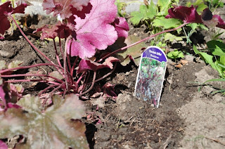 Cherry lubi półcień i cień i osiąga 20-45 cm. Cherry wsadzam więc pomiędzy śliwy i porzeczki – przez część dnia ten obszar jest zacieniony. Będą rosły koło hosty, więc mam nadzieję na ładny kontrast kolorystyczny :), Za to Chocolate wędruje do mojej nowo założonej rabaty bylinowo-cebulowej, po prawiej stronie. Dlatego, że trochę bardziej lubi słońce. Dorasta do 40 cm, sadzę ją trochę w rogu, żeby – jak się rozrośnie – wystawała na ścieżkę. Za nią rosną ostróżki, które ją przewyższą. Miejsce przed nią uzupełnię cebulowymi i jednorocznymi – taki jest plan. Sadzenie tak samo przebiega – dołek, woda, mokra sadzonka, ziemia, podlanie. Ponieważ wcześniej użyźniłam ziemię na tej nowo-założonej rabacie, teraz już nic nie dodaję. Voila!