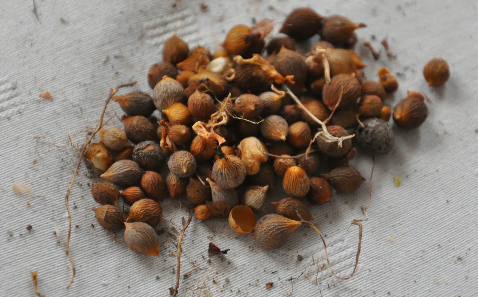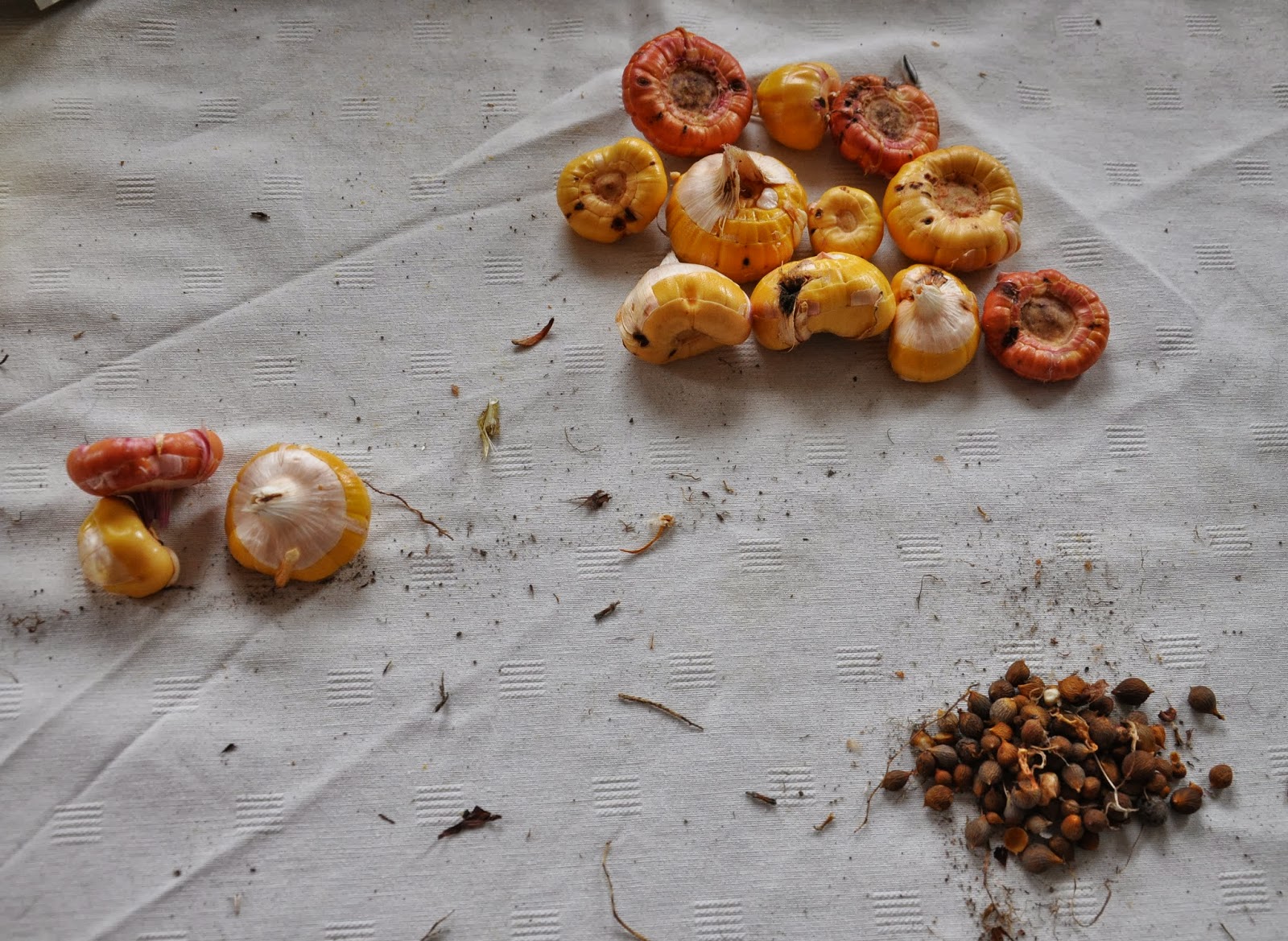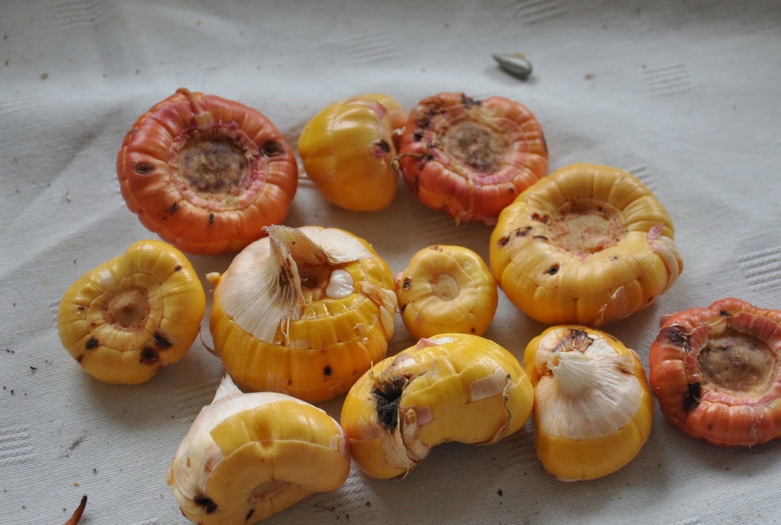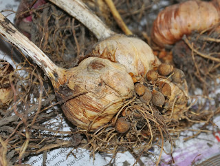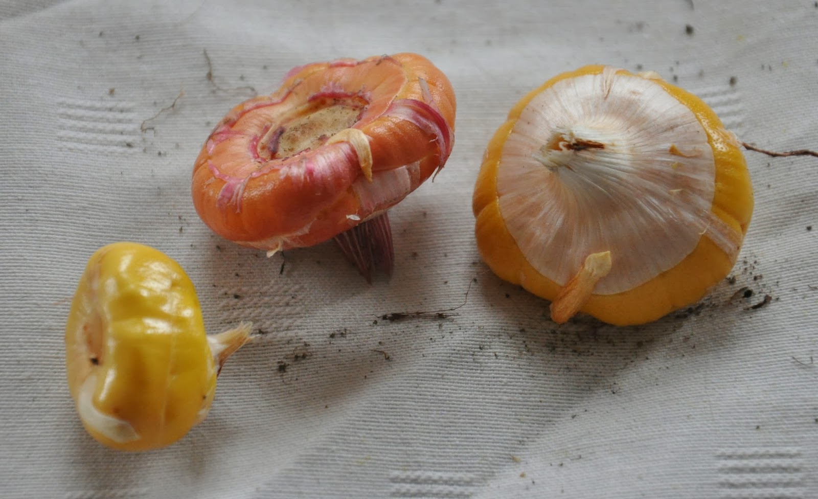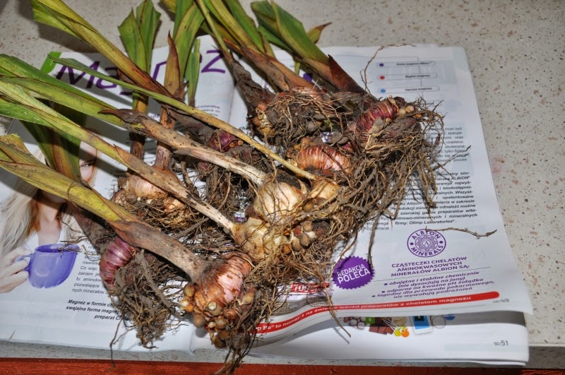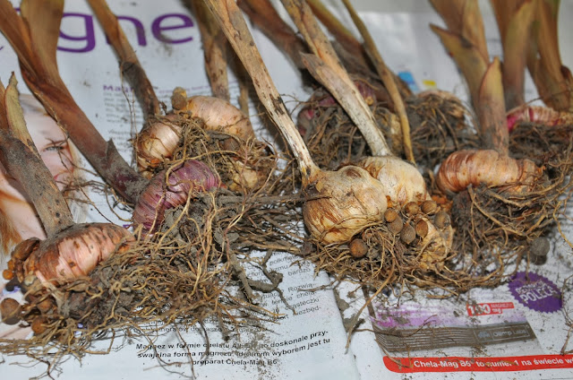 Przycięłam na kilka centymetrów i zabrałam do domu do wysuszenia. Po dwóch-trzech tygodniach można wyczyścić cebule z ziemi, oddzielić cebulki przybyszowe, jeśli są, oddzielić też mniejsze, wytworzone w tym roku cebule, oderwać stare korzonki i w suchym miejscu przechować, najlepiej w temperaturze kilku stopni Celsjusza. Niestety, zepsute, chore cebulki trzeba wyrzucić – w moim przypadku odkrywam ze zgrozą, że większość z nich ma jakąś czarną plamę to tu, to tam, albo jest przegryziona albo coś jeszcze…