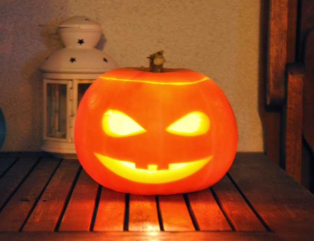 I oto bez zbędnych komentarzy – wydrążona dynia z wykrojoną gębą cieszy nas wieczorami, jak włożyć do niej podgrzewacz.