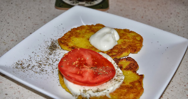 Potem pokroiłam te części na kawałki, wrzuciłam do naczynia i zblendowałam na papkę. Miałam miąższu z dwóch dyni wielkości tej na zdjęciu, do tego dodałam ok. 100 ml oleju, szczyptę soli, jajko i mąki tyle, żeby ciasto było nie za rzadkie. Odsyłam Was tutaj do internetu, bo przepisów jest mnóstwo, można dodać zioła, cebulkę, można zrobić na słodko, można zrobić bardziej puszyste z proszkiem do pieczenia i ogólnie kombinować. Ja już nie pamiętam, jakiego przepisu użyłam, trochę go zmodyfikowałam i trochę na oko próbowałam i na smak. Po pierwszej turze dodałam pieprzu, a placki usmażone na złoty kolor na patelni serwowałam z mozarellą i pomidorem, ze śmietaną albo na tzw. sucho.