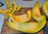 Dynie to moja miłość! Kiedyś w ogóle ich nie uprawiałam bo uważałam, że ziemia zbyt licha a dynia to potrzebuje żyznej itd, ale jak kiedyś przypadkiem zobaczyłam w internetach zdjęcia różnorodnych dyń zebranych właśnie z ogrodu, którymi ktoś się chciał pochwalić to tak mnie wzięło, że po prostu mi dech zaparło i zakochałam się w dyniach od pierwszego wejrzenia. Najpierw pokazałam je mamie i wszystkim, kto tylko chciał patrzeć, potem nazamawiałam nasion, chyba z 10 odmian (a była to pora październikowo-listopadowa) Stwierdziłam, że w moim ogrodzie będą wyłącznie dynie i będę miała mniej pielenia, bo pracowałam i nie miałam czasu a inne plony to były raczej symboliczne. Nasionami podzieliłam się z mamą a i tak miejsca na ogrodzie zabrakło i wykorzystałam każdy skrawek pod płotami i w każdym możliwym miejscu. Pod każdą dynię kopaliśmy spory dół i 20 litrów kompostu. Zużyłam wtedy cały mój kompost, nawet ten mniej dojrzały ale dynie naprawdę się udały. Była ich góra, kilkanaście taczek i były przeróżne, małe i duże, okrągłe i gruszkowate, gładkie i w paski czy z brodawkami, białe, kremowe, żółte, pomarańczowe, niebieskie, oczopląsu można było dostać. No to pojawił się problem gdzie je przechować bo naprawdę w tym gąszczu liści wcale nie wyglądało, że jest ich aż tyle. Jakoś zapakowaliśmy je do piwniczki i tu dramat bo okazało się, że nie było w niej dość sucho i chyba 3/4 zgniło i zasiliło mój nadwątlony kompost. Złamane serce ale miłość nie minęła, choć nasłuchałam się o mojej umiejętności planowania 🙂 Na przyszły rok już zredukowałam ilość odmian do jakichś 4, które wydały mi się najlepsze, przy czym najbardziej nie do ruszenia mam dwie, trzy. Co roku też próbuję dodać i wypróbować jakąś jedną i albo zostanie albo nie. Przechowywanie za to już nie w piwnicy tylko zwyczajnie, w kuchni i w pokoju na regałach:) Przechowują się świetnie. Jakiś tydzień przed świętami rozkroiłam jedną dużą i jeszcze dwie mi zostały mniejsze, jedna hokkaido i jedna butternut. Wykorzystywać się je nauczyłam też na różne sposoby bo i dynie są różne i nie każda się jednakowo do wszystkiego nadaje.