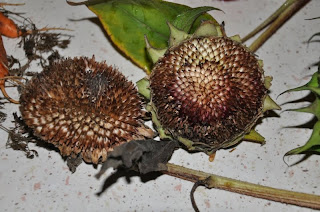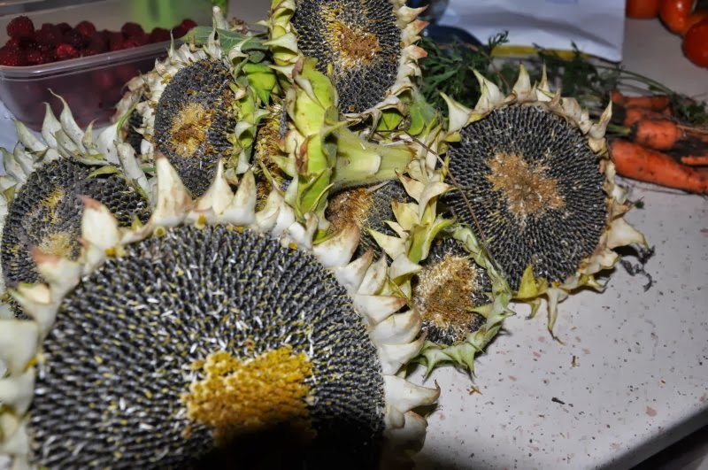 | Talerze słoneczników jadalnych (czarne nasiona)- jednak lepiej zebrać te największe, a mniejsze zostawić dla ptaków. |