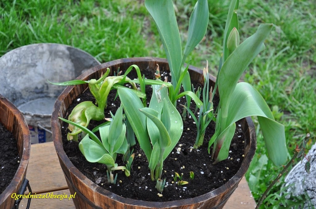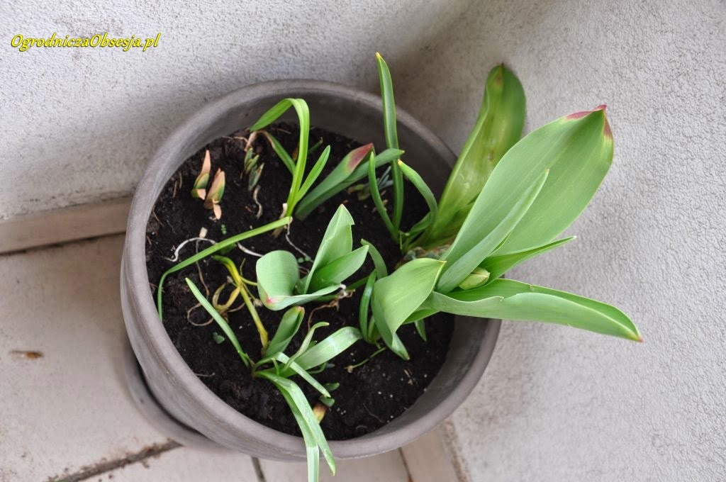 Teraz donice wyglądają jak powyżej. Na pierwszym zdjęciu jakby czas się zatrzymał na początku marca, końcówki przemarznięte. Nie rosną. W niektórych donicach tulipany wysuwają się na prowadzenie, ale jest to marne zwycięstwo. Wydaje mi się też, że męczą się w tych donicach, że być może za mokro mają? Drenaż był, nie podlewałam jakoś specjalnie, tyle co pogoda. Sadziłam też nie aż tak znowu gęsto. Podsypałam nawozem, nakarmiłam.