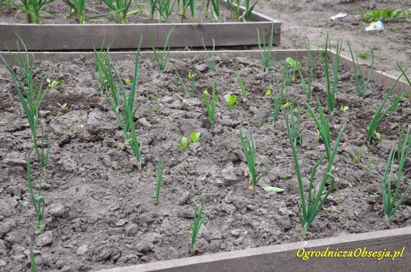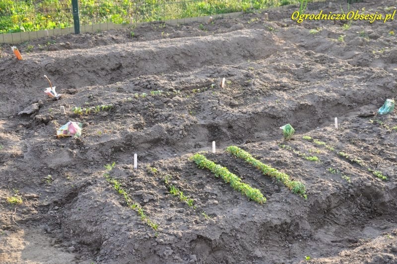 Dla marchewki przygotowaliśmy rydel, czyli długi kopiec – pozwoli to marchwi dobrze wykształcić korzeń w lepiej spulchnionej ziemi, natomiast trzeba pamiętać, że w takim rydlu ziemia szybciej wysycha. Dla reszty warzyw też uformowaliśmy takie lekko podniesione grządki i tutaj siejemy sałaty – różne rodzaje, pietruszkę, por, rzodkiewki, rukolę, szpinak oraz buraki. Wszystkie warzywa podpisuję (jeśli nie zużyłam wszystkich nasion) albo wbijam patyczek z opakowaniem po nasionach. Łatwo zapomnieć, co gdzie posialiśmy.
