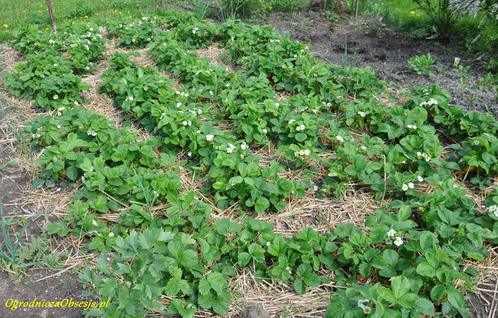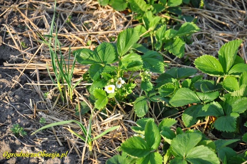 No i może nie warzywo, ale oto jak nasze ściółkowane słomą truskawki ładnie już kwitną: