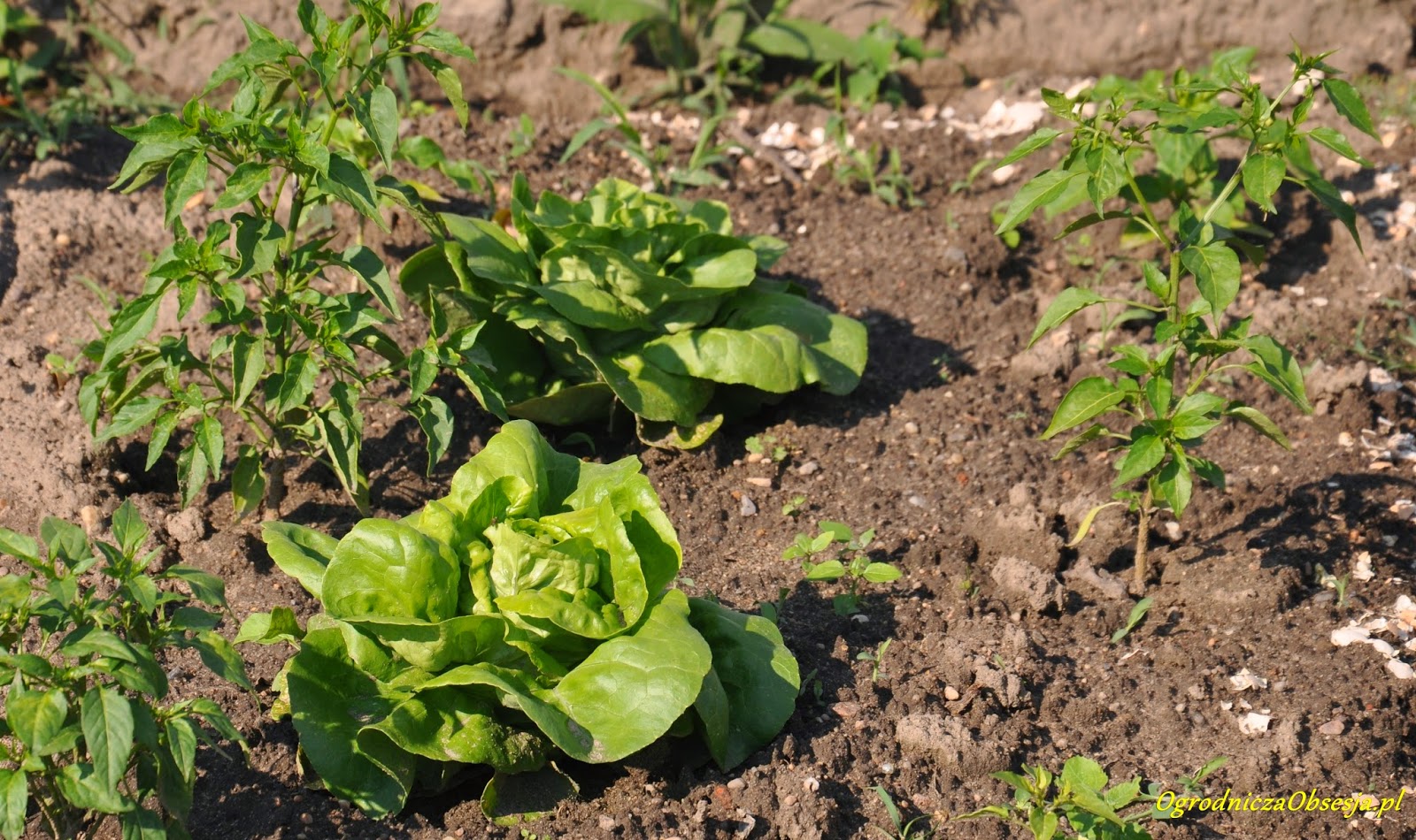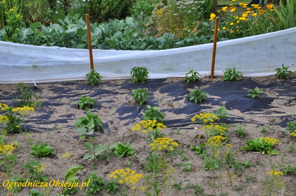 Są i papryki – mój pierwszy raz. Żadnej folii nie mam, ale zrobiliśmy osłonę z jednej strony od wiatru. Papryczki nie są duże, mają małe kwiatuszki no i zobaczymy, co z nich wyrośnie. Mamy Cherry Chilli, duże czerwone i białe odmiany… a, do tego jeszcze kilka bakłażanów – ostały się tylko dwa 🙂 Jestem ciekawa, czy coś z tego w tym sezonie zjemy 😀