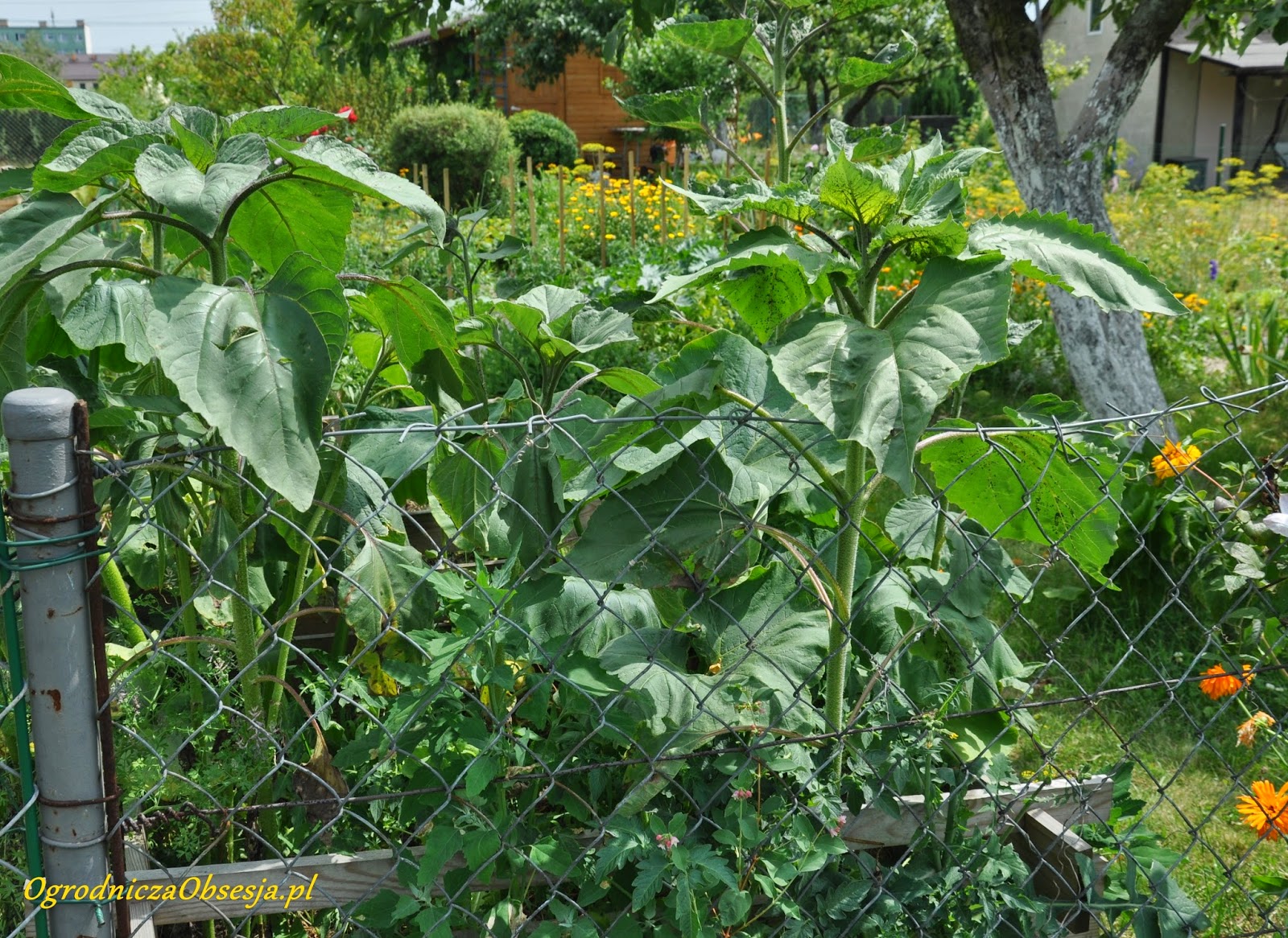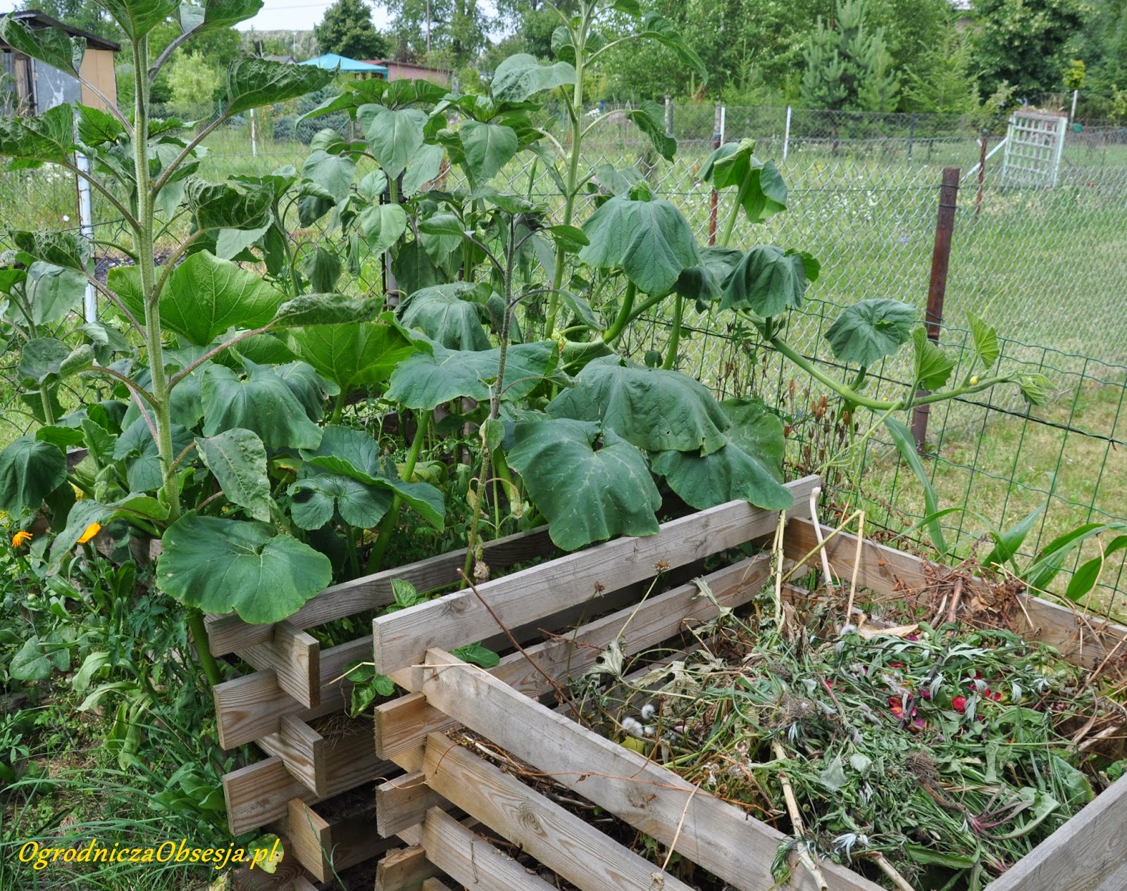 Nie mogę nie wspomnieć o kompostowniku, na który rzuciłam kilka nasion dyni, które mi zostały… Szaleją! Dynie – chyba dwie albo trzy – rozrosły się, jak szalone, pomiędzy nimi pomidory (chyba z odpadków, bo żadnych pomidorów tam nie siałam!) i słoneczniki (tak samo – przezimowały, dranie). Biedna kukurydza ozdobna, którą posiałam za kompostownikiem, żeby go zasłonić, teraz przebić się nie może… 😀 Wszystko najlepiej tam rośnie, mam już problem, żeby przekierować ze strony sąsiada z powrotem do nas… Chyba też w tym roku skorzysta… 🙂