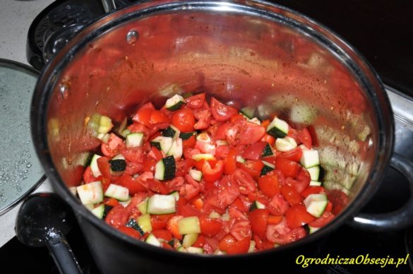 Cebule kroimy i podsmażamy na oleju w garnku. Siekamy też czosnek i dorzucamy. Można podsypać soli. Kiedy cebula się zeszkli, czas na resztę warzyw. Pomidory, paprykę i cukinię – wszystkie ze skórką, kroimy w kostkę i wrzucamy do garnka, mieszamy i gotujemy pod przykryciem, aż zmiękną. Paprykę ostrą można albo pokroić w kostkę i wrzucić razem z tymi warzywami, albo w całości wrzucić do gara, aby na koniec wyjąć.