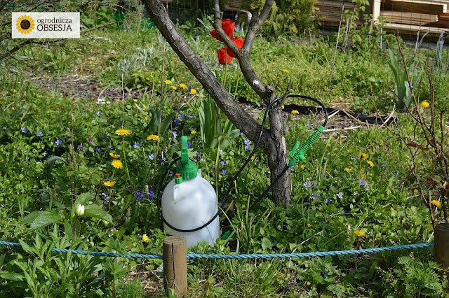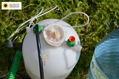 Na brzoskwini i moreli już pojawia się kędzierzawość. Skrzypu jeszcze nie ma, ale czosnek mam jeszcze jary z zeszłego roku zbiór mój własny. Rozdrobniłam trochę i zalałam wodą na noc. Rano przyniosłam i tak oto sobie radzę.Gazy kawałek obwiązałam sznurkiem, żeby oddzielić te kawałki czosnku od płynu. No i przelewam bezpośrednio do pojemnika opryskiwacza. Po prawej stronie zdjęcia widać kawałek butelki… tak, to plastikowa butelka – tak! Niestety, na szybko nie miałam w czym zakisić tego wieczorem, więc do plastiku wrzuciłam… tak było. No i tyle, trudno – nie zawsze jestem 100% eko-bio-super-permakulturowa, ale staram się… Kawałki czosnku pozostałe można rzucać tam, gdzie się stoi, ja natomiast postanowiłam to wykorzystać i poupychać do dziur norniczych – a nuż je do odstraszy od pysznych korzonków trochę…. sio sio do sąsiada… 😡 najlepiej do lasu, ale najbliżej niestety sąsiad…