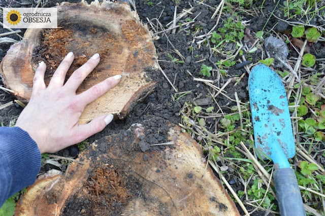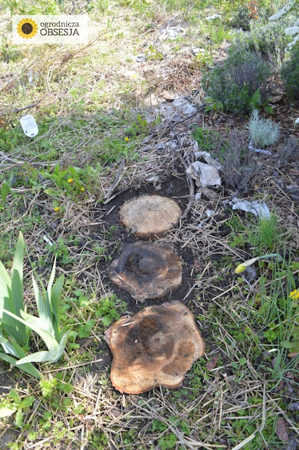 A propos wykorzystywania różnych rzeczy w ogrodzie, pisałam tutaj. Przykład trochę smutny – spacerując po lesie, natrafiłam na wycinkę – i znalazłam 3 takie kawałki pni drzew. No to zabrała ja… i postanowiłam sobie kawałek ścieżki ułożyć.