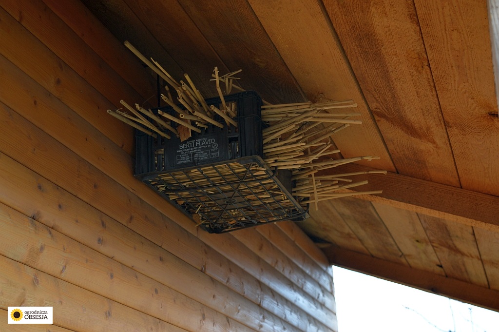 Domek powinien wisieć w miejscu osłoniętym od bezpośredniego deszczu i wiatru, najlepiej zrobić mu daszek z desek, a ja postanowiłam powiesić pod dachem altany. Wiem, że np. murarki lubią nasłonecznione miejsca, ale w tym wypadku było to najlepsze wyjście.