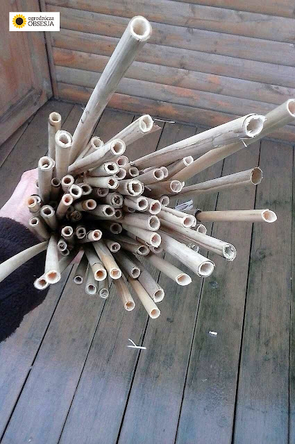 Skrzynkę wypełniłam materiałami, które miałam – rurkami trzcinowymi, uciętymi tak, żeby z jednej strony było kolanko (czyli rurka jest zaślepiona), a z drugiej wylot. Nie wszystkie rurki były na tyle długie, więc przy tych dłuższych zdarza się, że są dwa kolanka w środku i wyloty z dwóch stron. Z takich rurek korzyści mają zwłaszcza pszczoły murarki, bo zasiedlają je z jednej strony i budują (murarki wszak) – gromadzą pyłek, składają jajeczko, budują ściankę, znowu pyłek, jajeczko, ścianka i tak dalej.