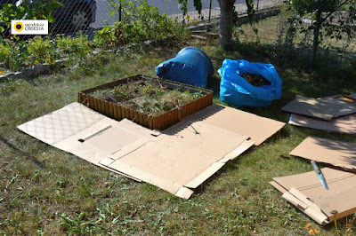 1. Na trawniku rozłożyłam kartony tak, żeby nie było prześwitów.