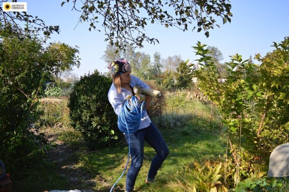 Więc biorę paliki, sznurek, młotek i miarkę. Paliki chcę wbić tak, jak poprzednie – co około 90 cm.