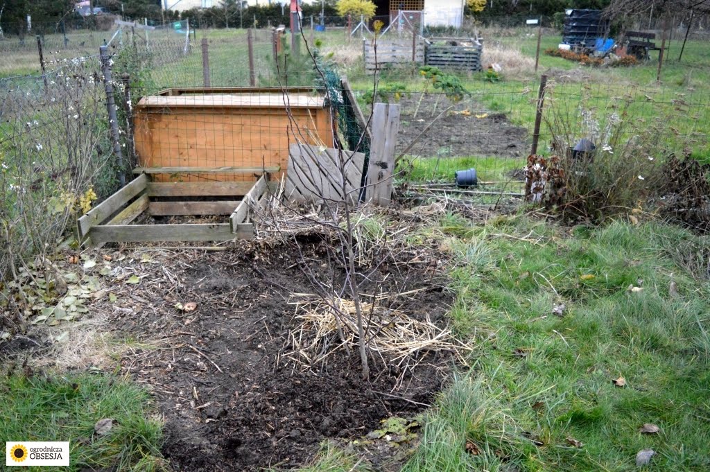 Do dołu wlałam wodę i przysypałam ziemią, która akurat w tej części jest fajna, bo były tu zrębki kompostowane. Przysypałam też nimi i na wiosnę się okaże, czy się przyjęła.