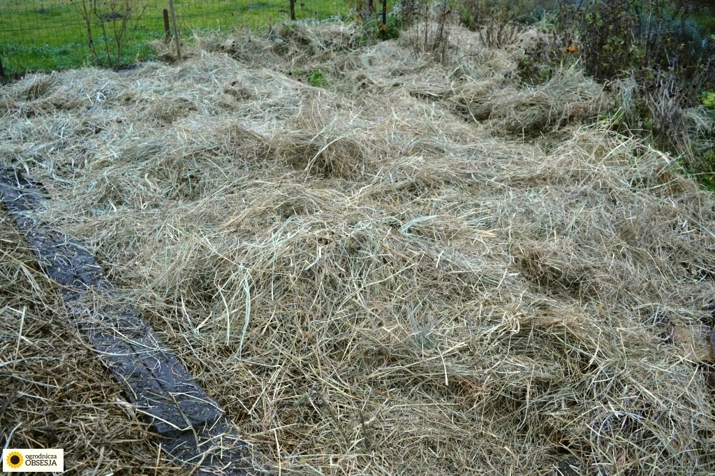 Do tej pory używałam słomy. W słomie nie ma nasion traw, nie ryzykujemy rozsianiem i tzw. zachwaszczeniem. Za to były nasiona zbóż, a one także mi posłużyły za dodatkową ściółkę po ścięciu. Do tego słoma to takie grubsze źdźbła, siano jest bardziej miękkie, zbija się łatwiej.