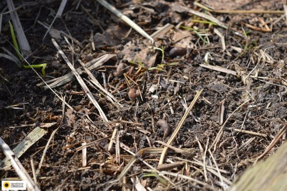 1. Odkrywam ziemię – na jakiś czas odkrywam ściółkę tam, gdzie karton się do końca nie przerobił (po bokach, gdzie było bardziej sucho) lub po prostu rozgarniam tą przerobioną. Tym sposobem ślimaki wyniosą się, a jajeczka może wyschną? Tak czy siak, będą musiały przenieść się w inne miejsce.
