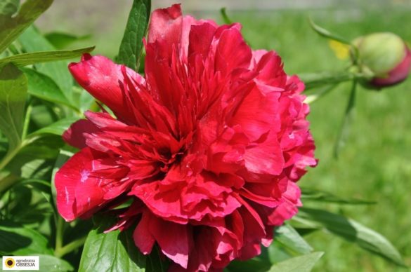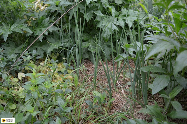 Wczesną wiosną postanowiłam wsadzić dymkę wśród kwiatów, na takim małym, w miarę wolnym kawałku, którego jeszcze żadna roślina nie zagarnęła. Jest tam trochę cienia, pomyślałam, że potem dosadzę jeszcze sałaty. Po paru tygodniach zorientowałam się, że z ziemi wychodzą piwonie wprost na tą dymkę, w związku z czym są teraz cebule obok i w środku samej kępy.