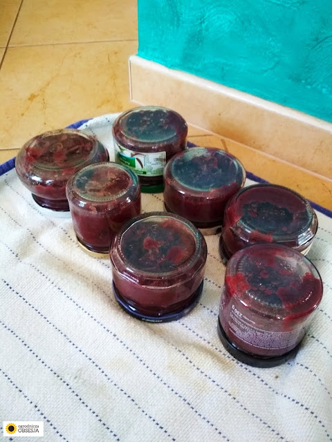 Słoiki zagotowałam w garnku z wodą jeszcze dla pewności z 20 minut tak, żeby zassały. Myślę, że spokojnie można gorący dżem przełożyć do słoików i zakręcić, postawić do góry dnem i dać wystygnąć.