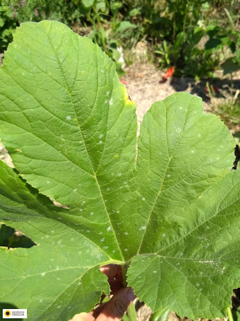 Mączniak rzekomy pojawia się często na różnych roślinach, w tym na warzywach, np. dyniach, cukiniach. U mnie często występuje na winorośli w późniejszym okresie, np. wrześniu. Prewencyjnie warto pryskać regularnie wywarem ze skrzypu, niektórzy polecają pryskanie np. rozcieńczonym mlekiem w celu zasiedlenia części rośliny przez te dobre szczepy (ja tego jeszcze nie próbowałam, może za rok). Ale czasem mączniak i tak się pojawia i można pierwsze sygnały wychwycić i liście nimi dotknięte usuwać. Na niektórych odmianach dyniowatych można pomylić mączniak z plamami właściwymi danemu gatunkowi, dlatego przedstawiam parę zdjęć, na których wyraźnie widać, co jest co.