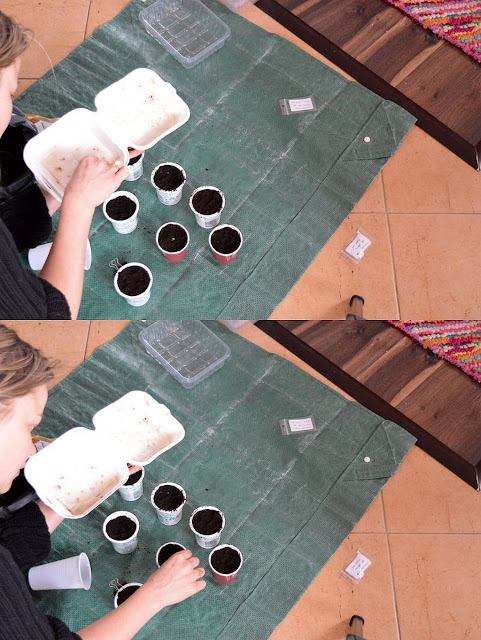 Wypełniłam ziemią (warto też od razu podlać tą ziemię), każde już kiełkujące nasionko delikatnie pęsetą przeniosłam do doniczki i przykryłam ziemią. Podlałam.