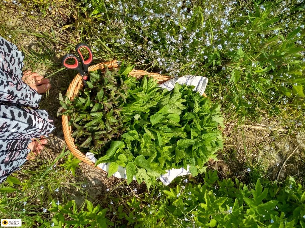 Cały kuchenny stół mam zawalony suszącymi się ziołami, które mieszam i komponuję z nich różne „herbatki”. W skład wchodzą: 3 rodzaje mięty, cząber, lawenda, melisa, płatki róż. Suszę też oregano, ale jakoś ono mi nie pasuje do herbatek, podczas gdy cząber bardzo.