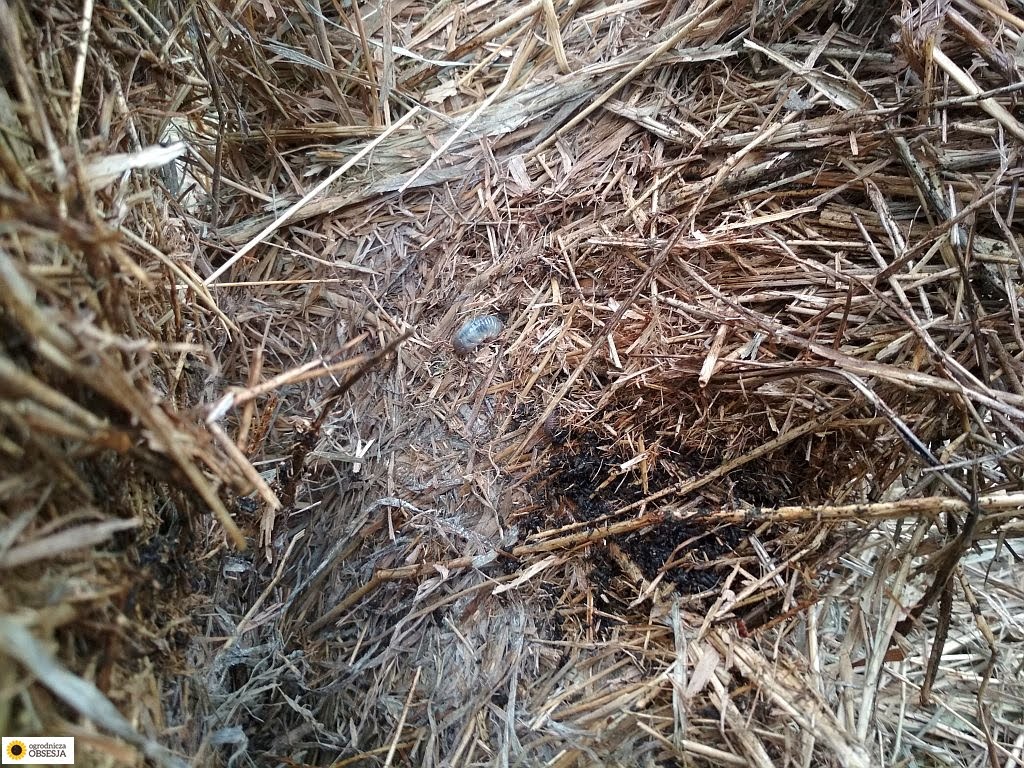 Pędraki kruszczycy nie żywią się korzeniami roślin, a rozkładającymi się szczątkami, spróchniałym drewnem no i jak widać sianem. W związku z tym w ogrodzie można je uznać za bardzo pożyteczne, bo pomagają nam rozkładać materię organiczną. Stąd też w kostkach mnóstwo było czarnych odchodów, podobnych do odchodów mysich, że aż pomyślałam, że mysz polna w tej kostce chyba ma gniazdo.