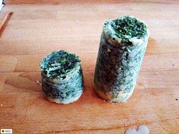 Na zdjęciach widać, że koperek nieco opadł na dół – myślę, że ta ogromna jego ilość tutaj pomogła, bo gdyby było go mniej, pewnie większość byłaby na dole. Dlatego właśnie lepiej jest nie podgrzewać masła na ogniu, ale dać mu zmięknąć poza lodówką, wymieszać i przełożyć do pojemników.