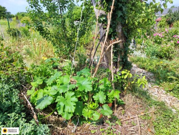 Pod starą i już chorą papierówką przez ostatnie sezony często wyrzucałam wycięte końcem lata i jesienią rośliny. Tym sposobem uzyskałam tam fajne miejsce z żyzną glebą. W tym roku posiałam tam dynie, cukinie i fasolę tyczną. W związku z tym, że fasola potrzebuje się piąć, wykorzystałam do tego materiały, które miałam: tyczki z forsycji i innych, długich gałęzi oraz miskanta, sznurki, zaczepy oraz sam pień drzewa.